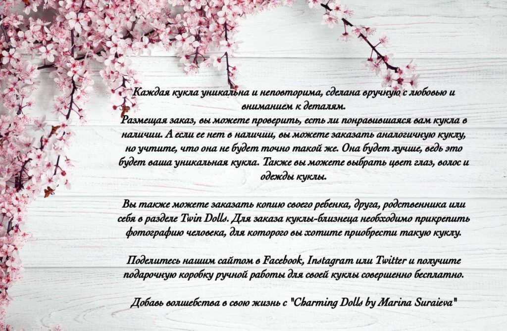 Every doll is unique and inimitable, handmade with love and attention to the details. By placing an Order, you can check availability of the doll you like and if it’s not available, you can order similar doll, but kindly note that it won’t be exactly the same. It will be better as it will be your own unique doll. You can also choose the colour of eyes, hair and clothes of the doll. You can also order a copy of your child, friend, relative or yourself under the section Twin Doll. For ordering Twin doll you, please, attach a photo of a person for whom you wish to have a twin doll. Share our site on Facebook, Instagram or Twitter and get a free handmade gift box for your doll.